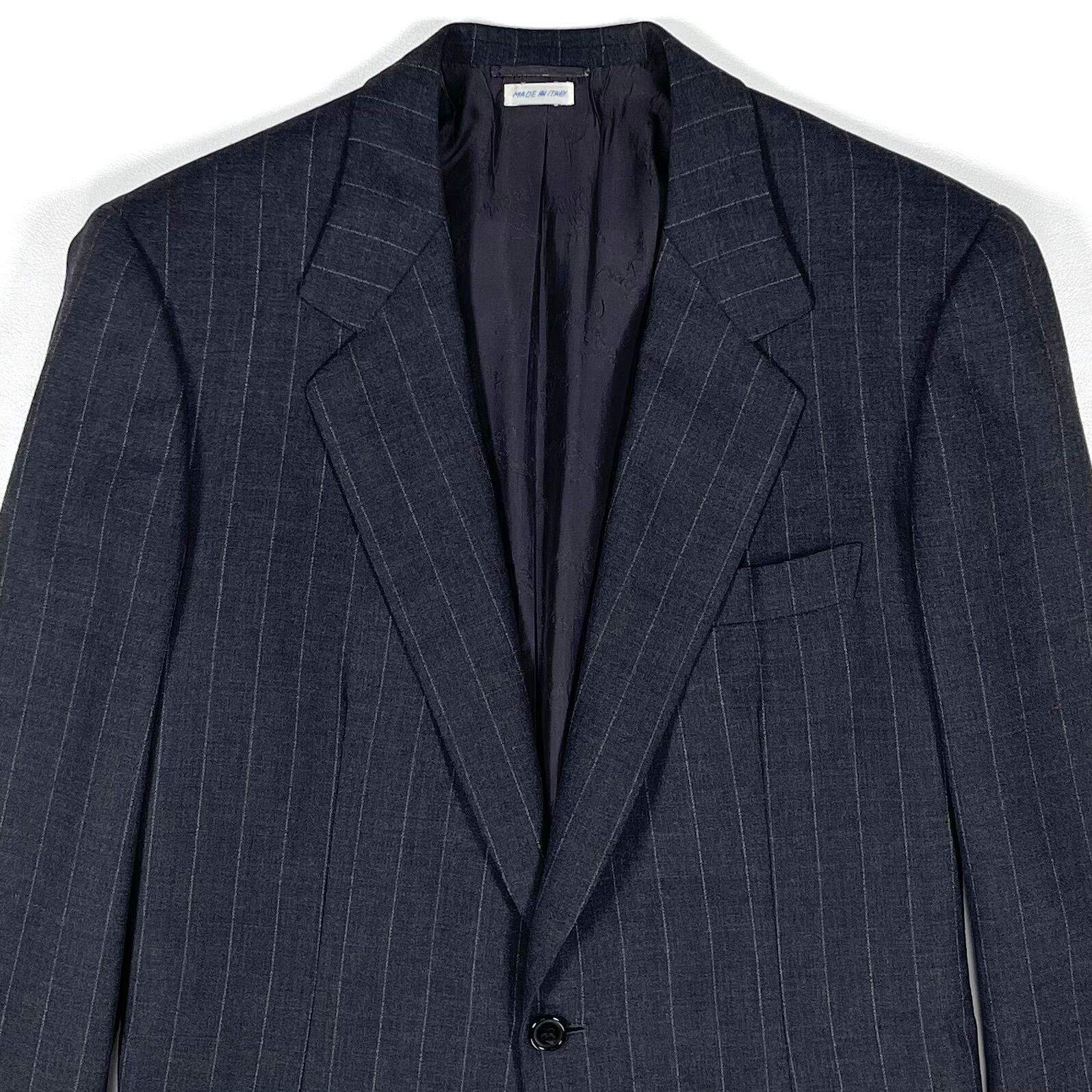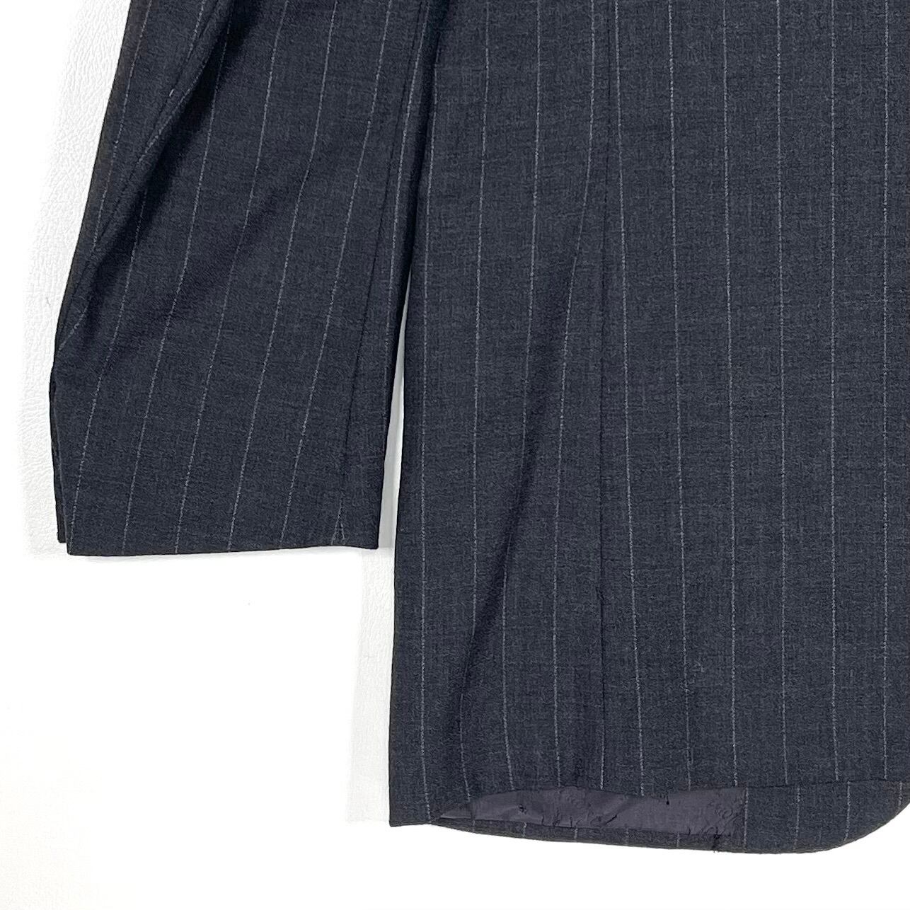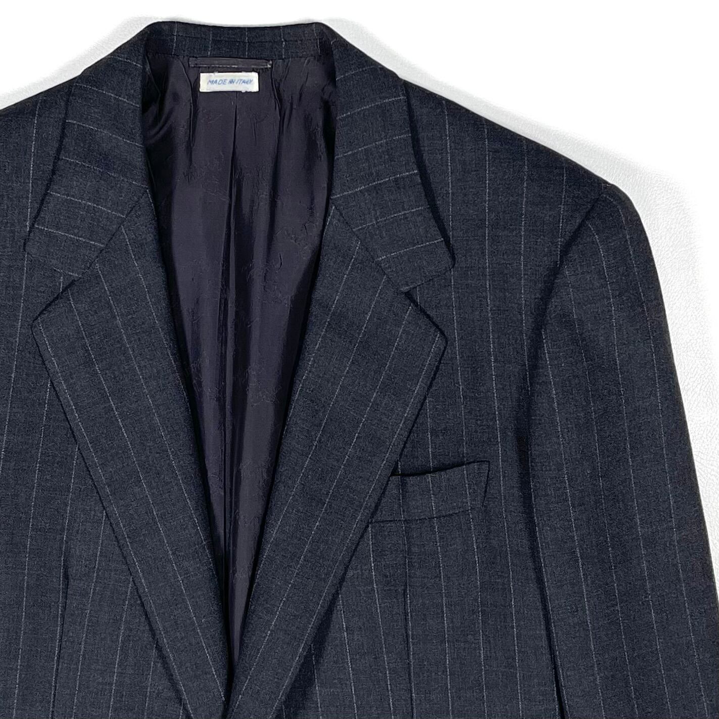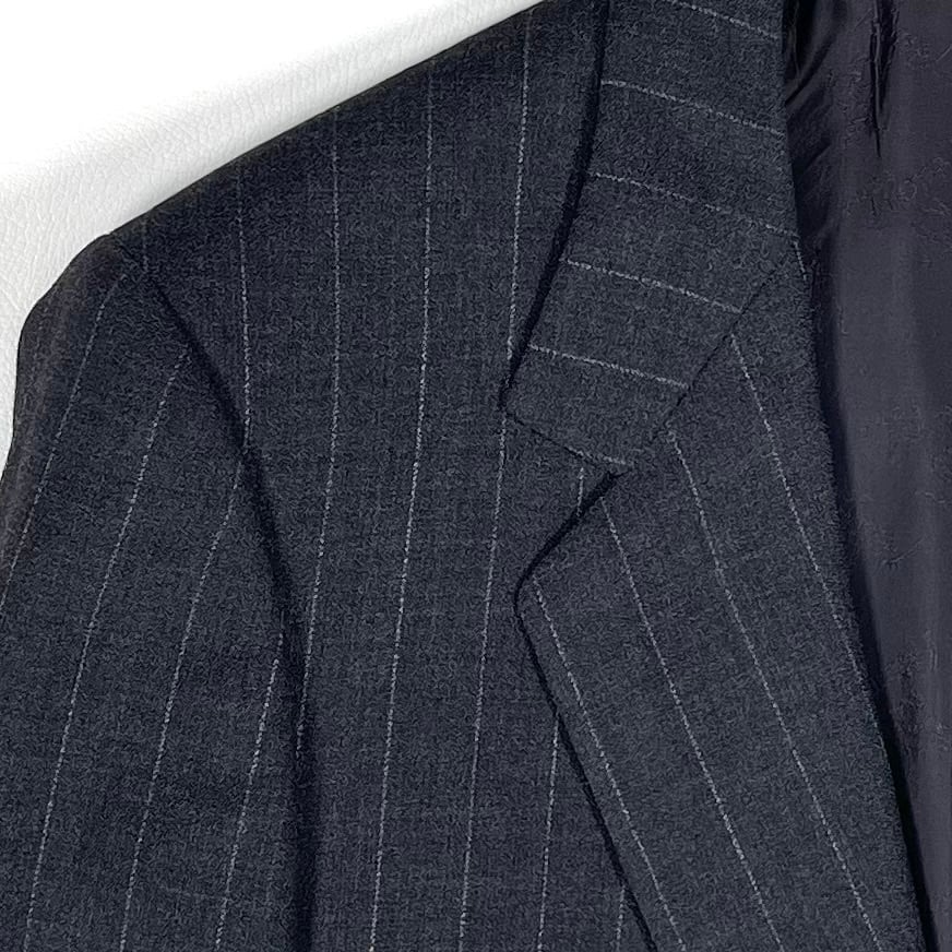 A tailored jacket with a striped pattern in charcoal gray and white pinstripes. The front has two buttons, and the sleeves have three buttons. No vent. The jacket has a slightly longer length for a balanced silhouette. Made from a soft wool fabric. Made in Italy.