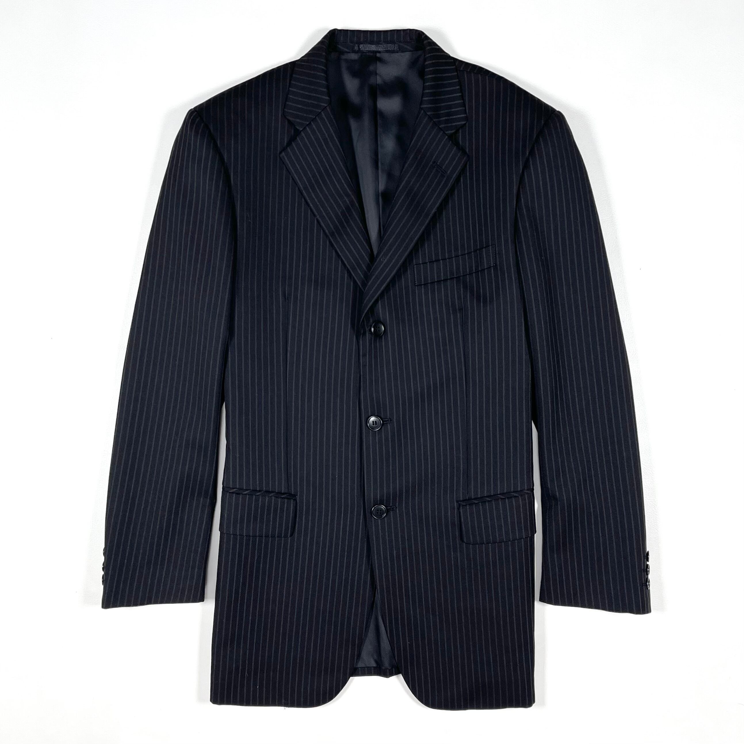 A classic tailored jacket made from wool fabric in charcoal black with white pinstripes. It features a narrow V-zone with a 3-button front and 3 buttons on the sleeves. This is a classic three-button tailored jacket.