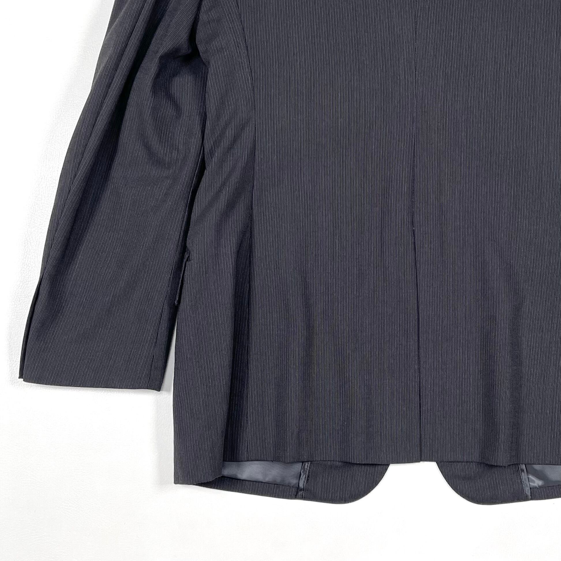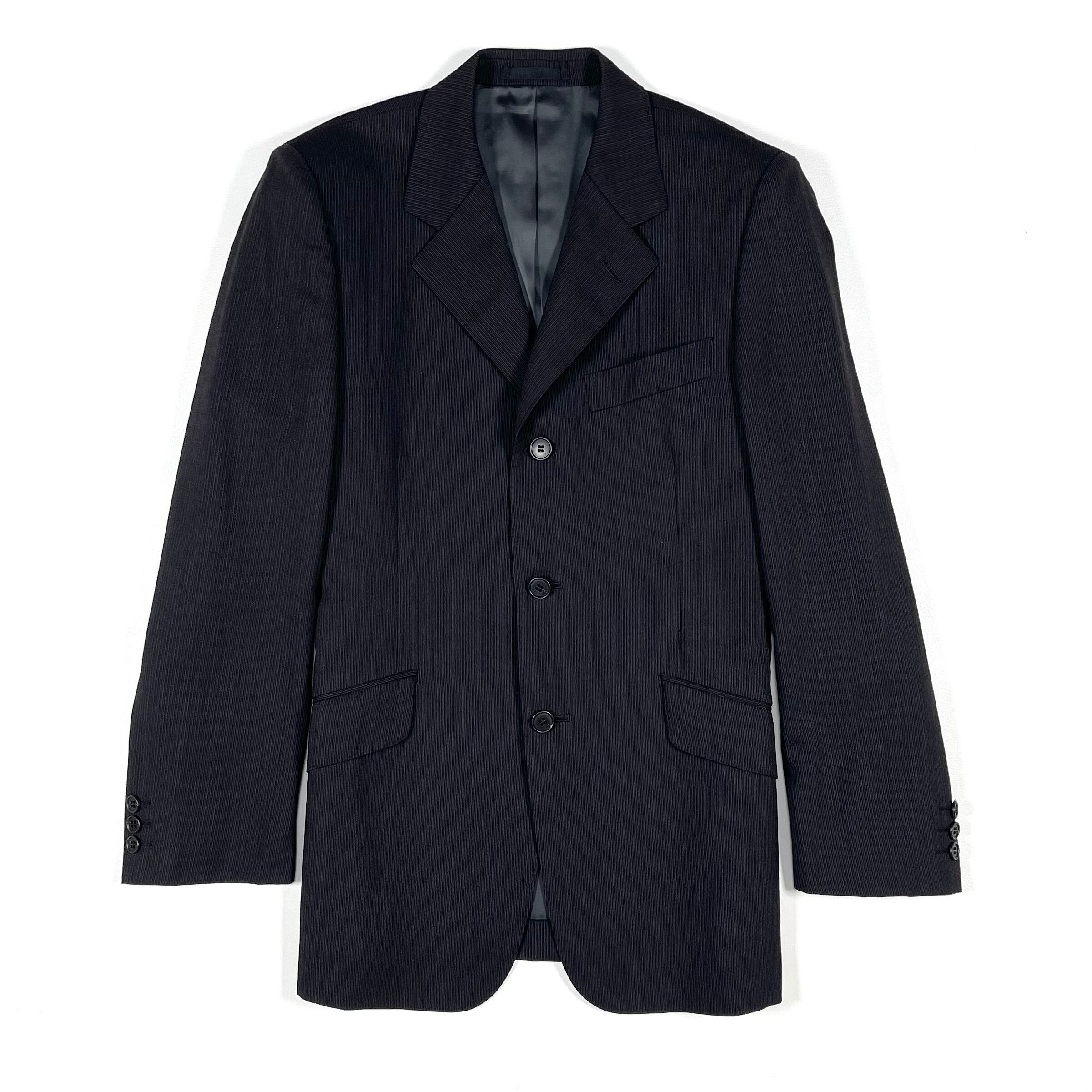 A classic tailored jacket in a charcoal gray woven stripe pattern. Made from a smooth polyester and wool blend material. The front features 3 buttons, and the sleeves also have 3 buttons. The jacket has a center vent, and the V-zone is narrow, giving it a classic tailored look with a 3-button front.