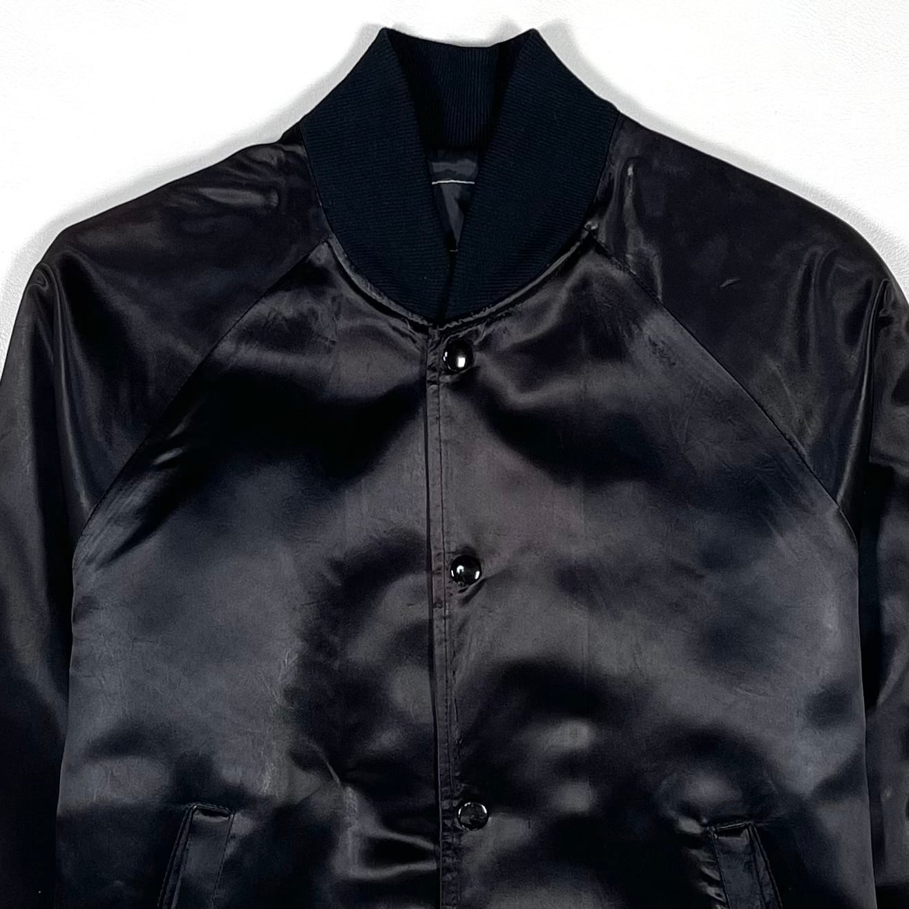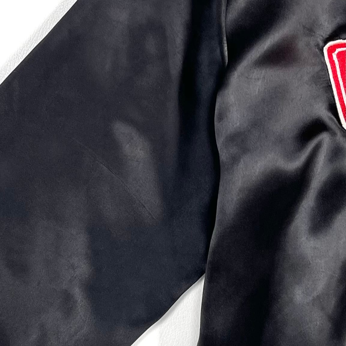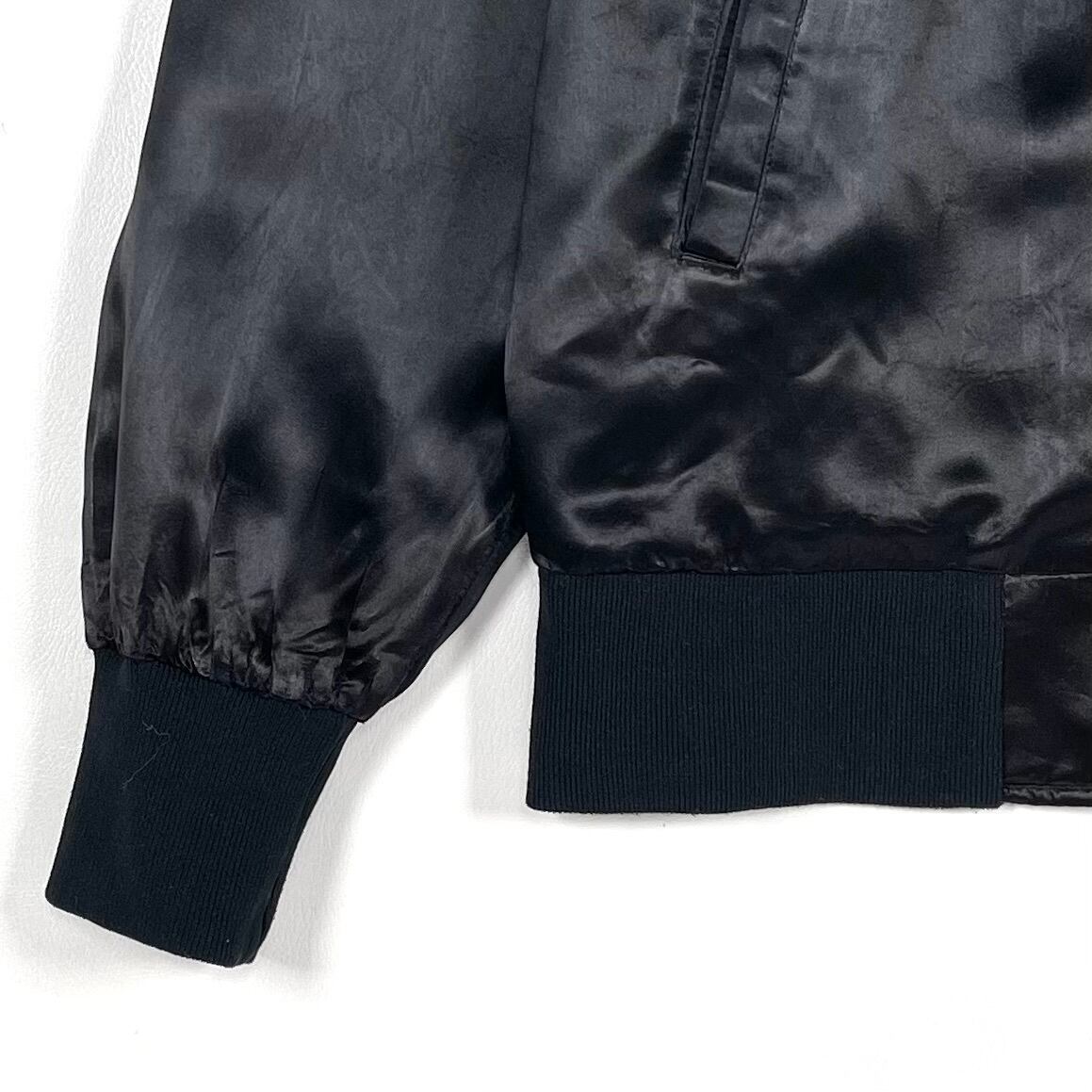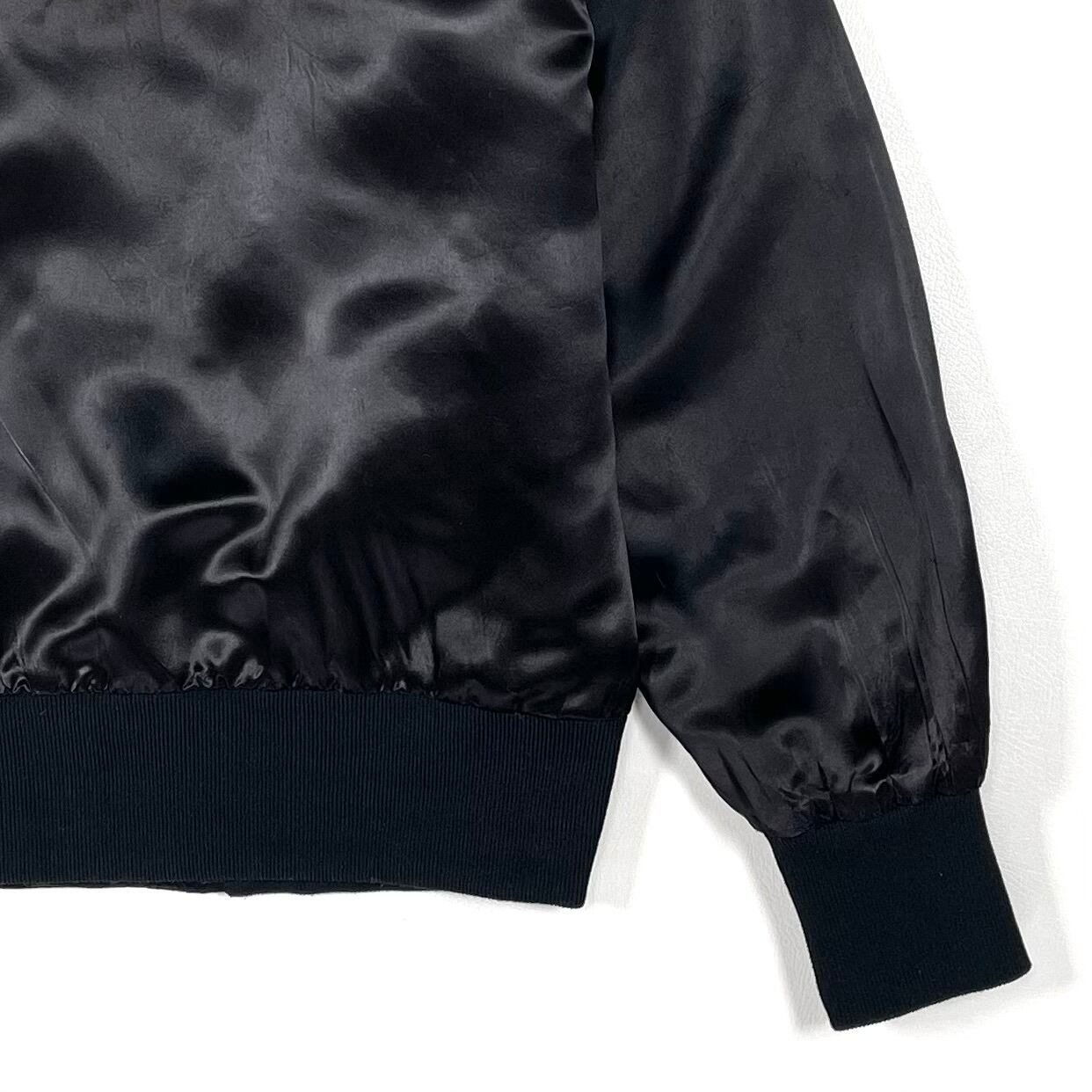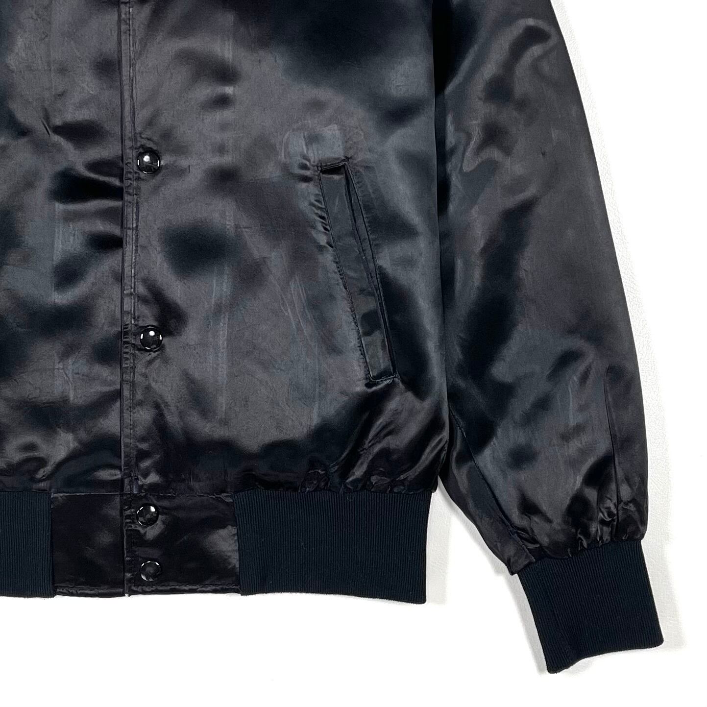 A black satin blouson jacket with “CARD SHARKS” embroidery on the back. The fabric is glossy satin, made from nylon. The front features snap buttons, designed in a stadium jacket style. There is wear around the pockets and cuffs, with slight sun damage on the shoulders. This item shows signs of wear from use, and the tag is missing.