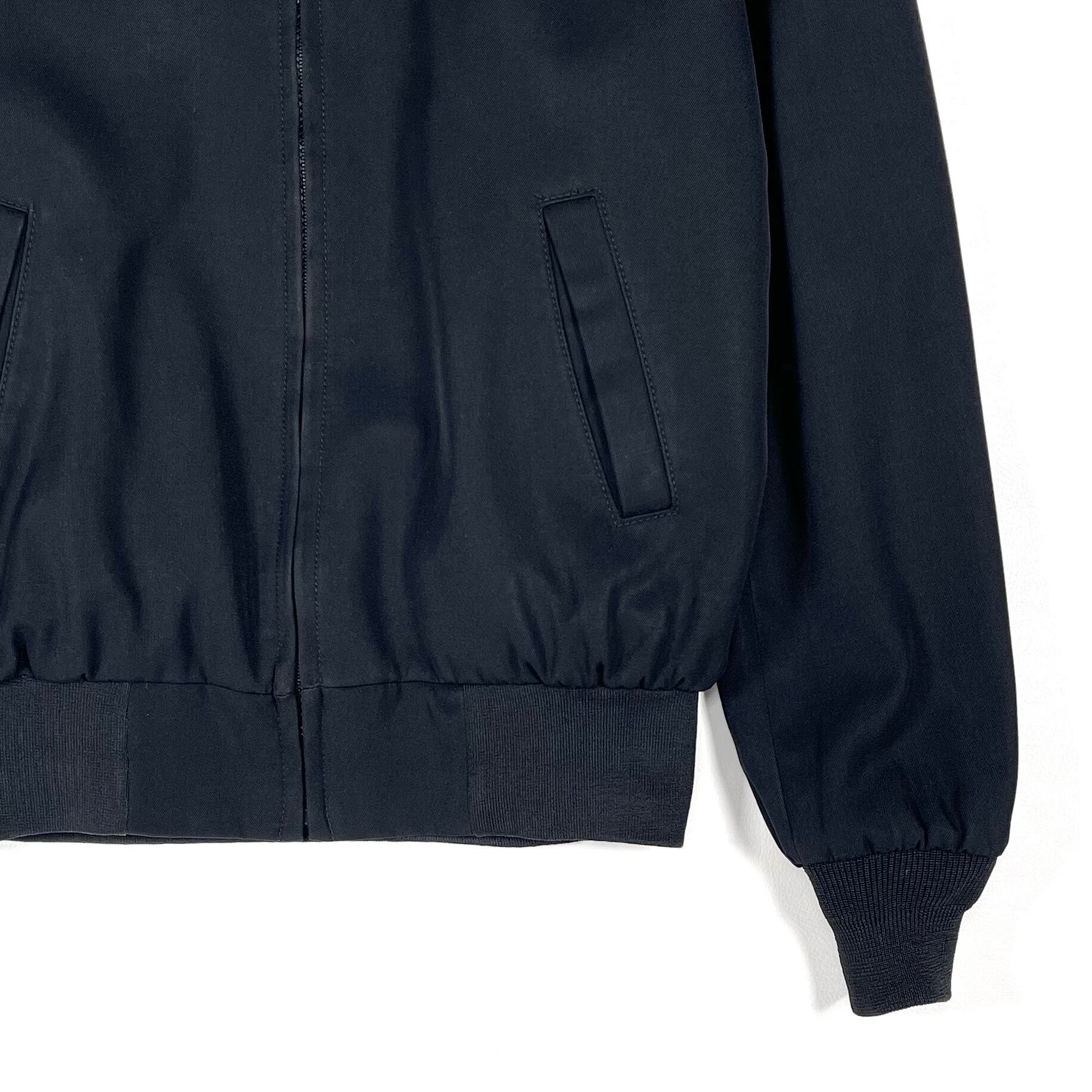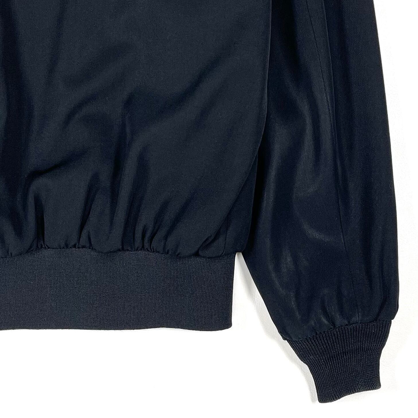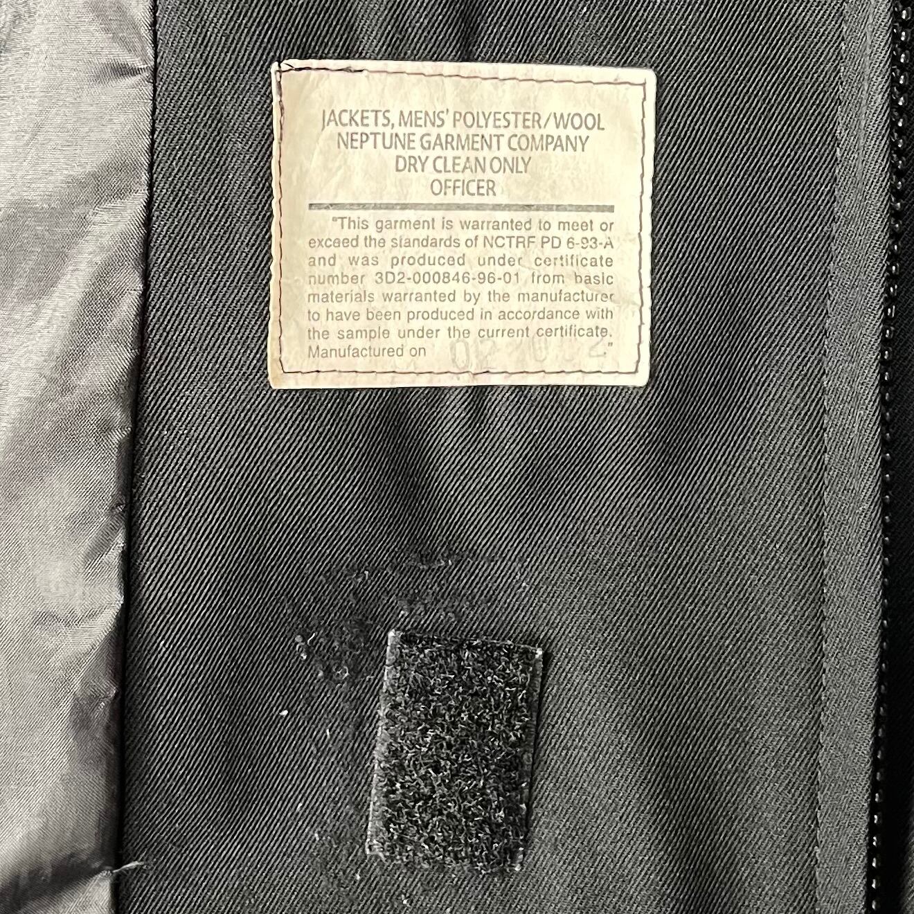 A black officer jacket with a front zipper and epaulets, designed in a blouson style. Made of a polyester and wool blend. The jacket shows characteristic signs from cleaning and has slight wear on the sleeve cuffs.