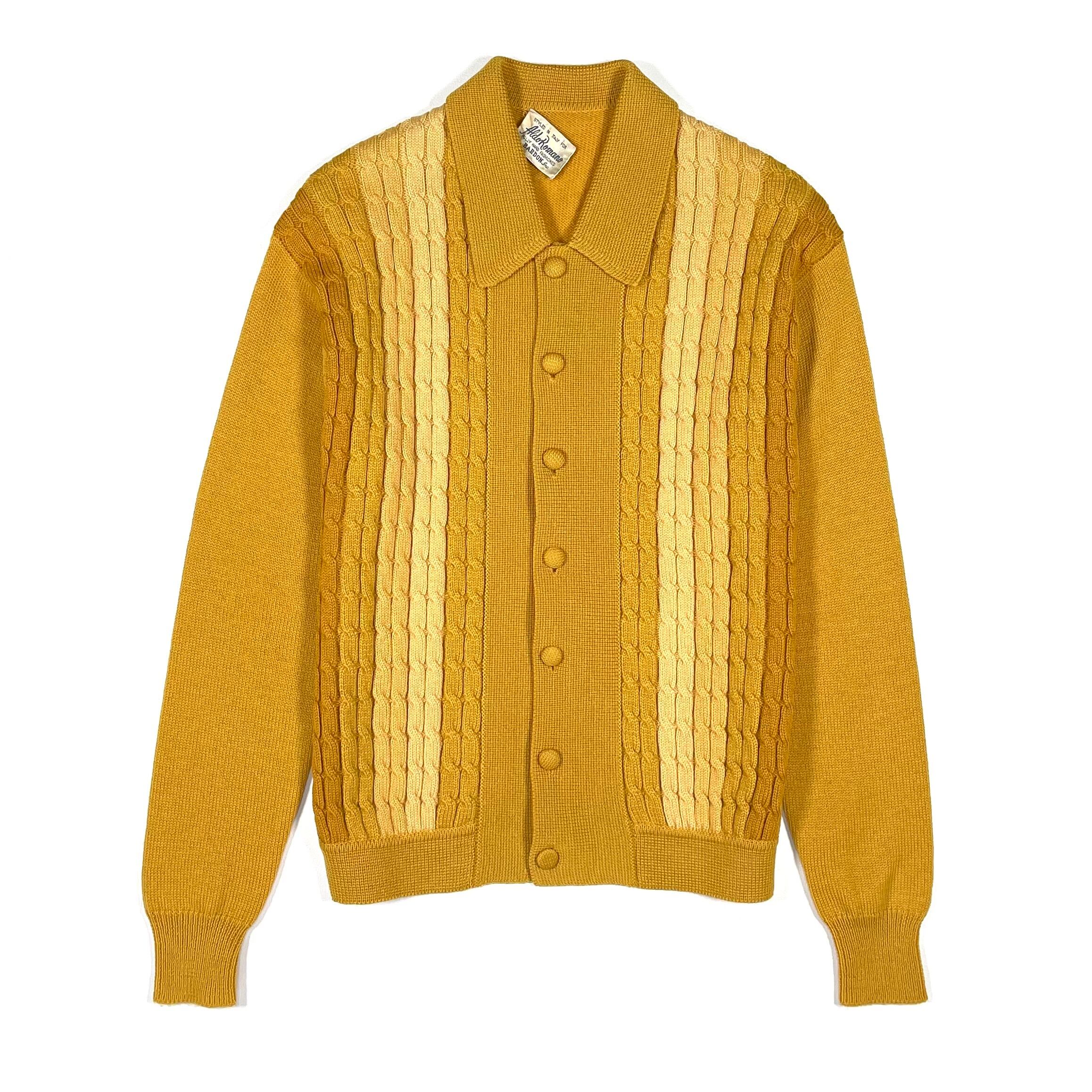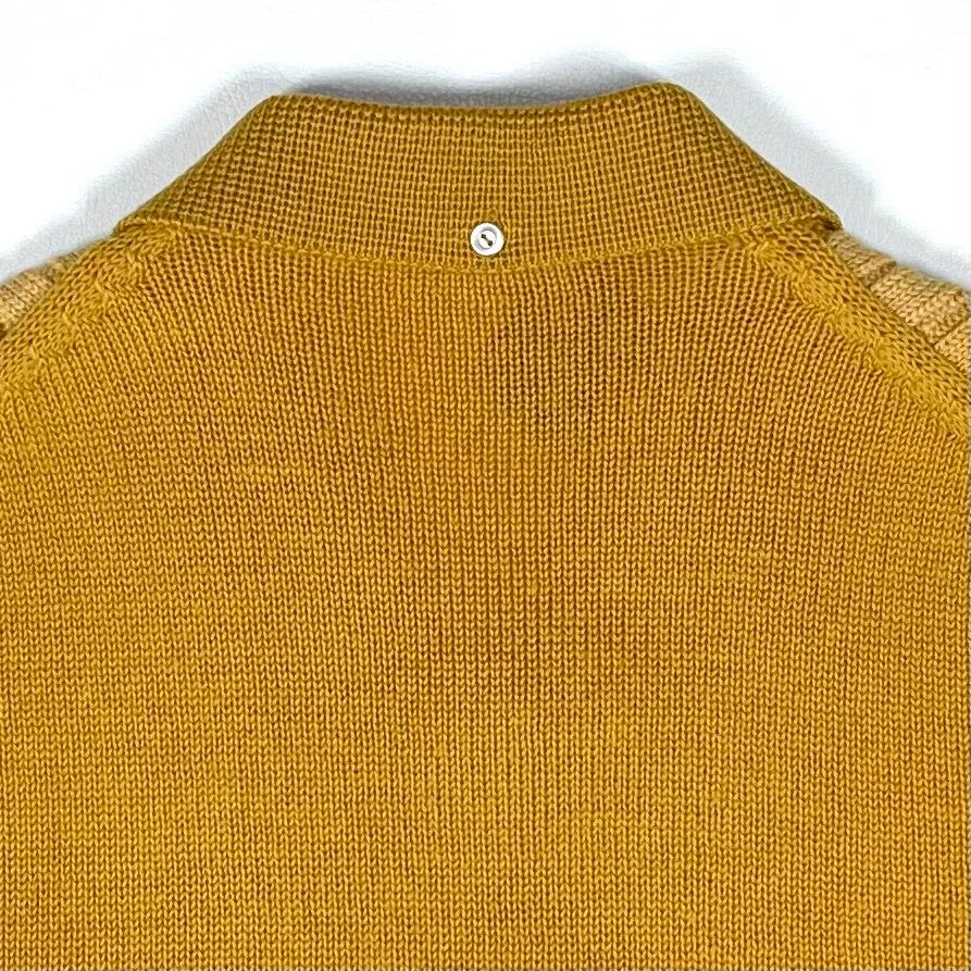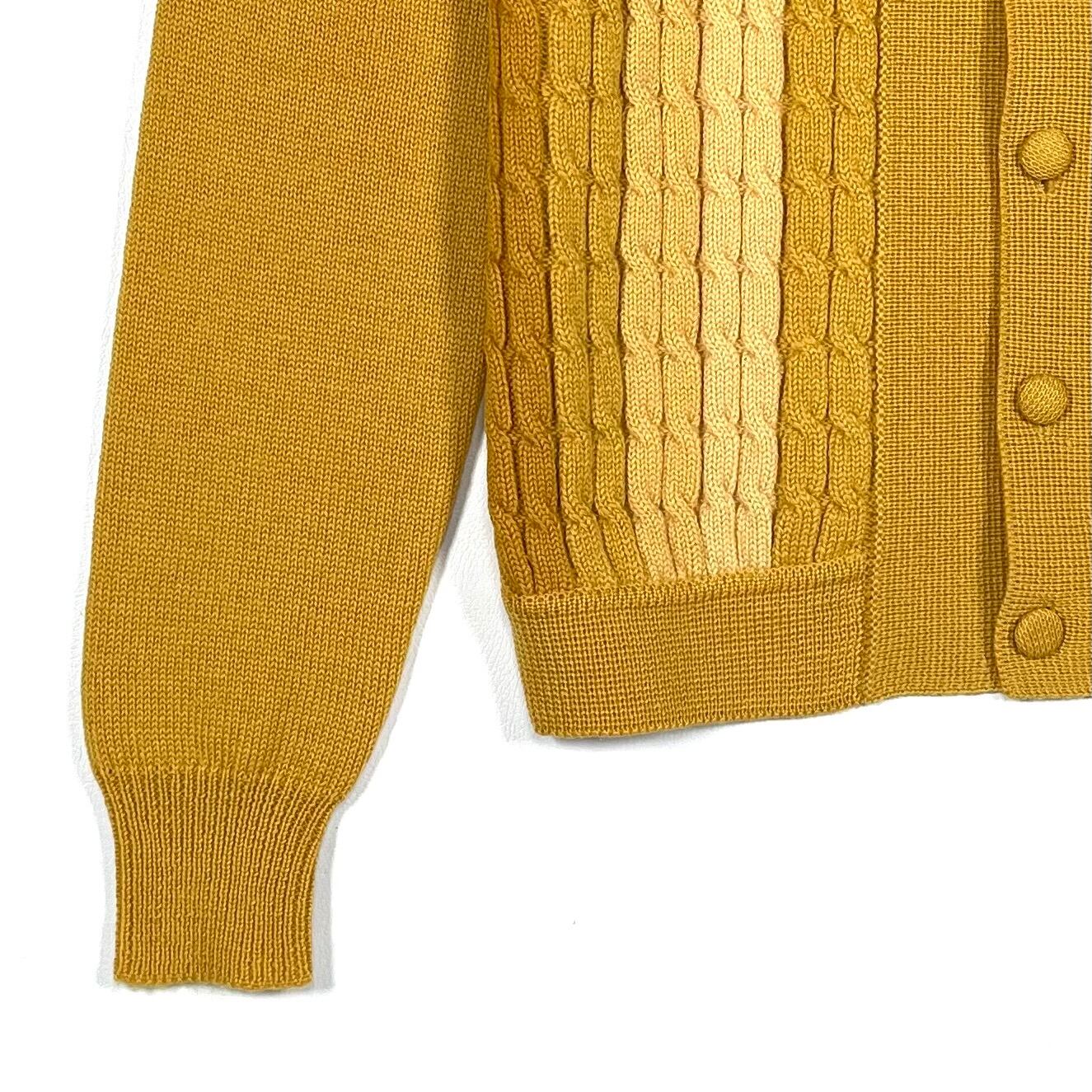 A wool cardigan with a collar in a mustard tone. The front features a cable-knit design in a gradient color. The buttons are fabric-covered, matching the knit (with 2 spare buttons included). Made from wool knit. This cardigan has great color and design. There is slight pilling typical of wool knits due to wear. The tag is about to come off.