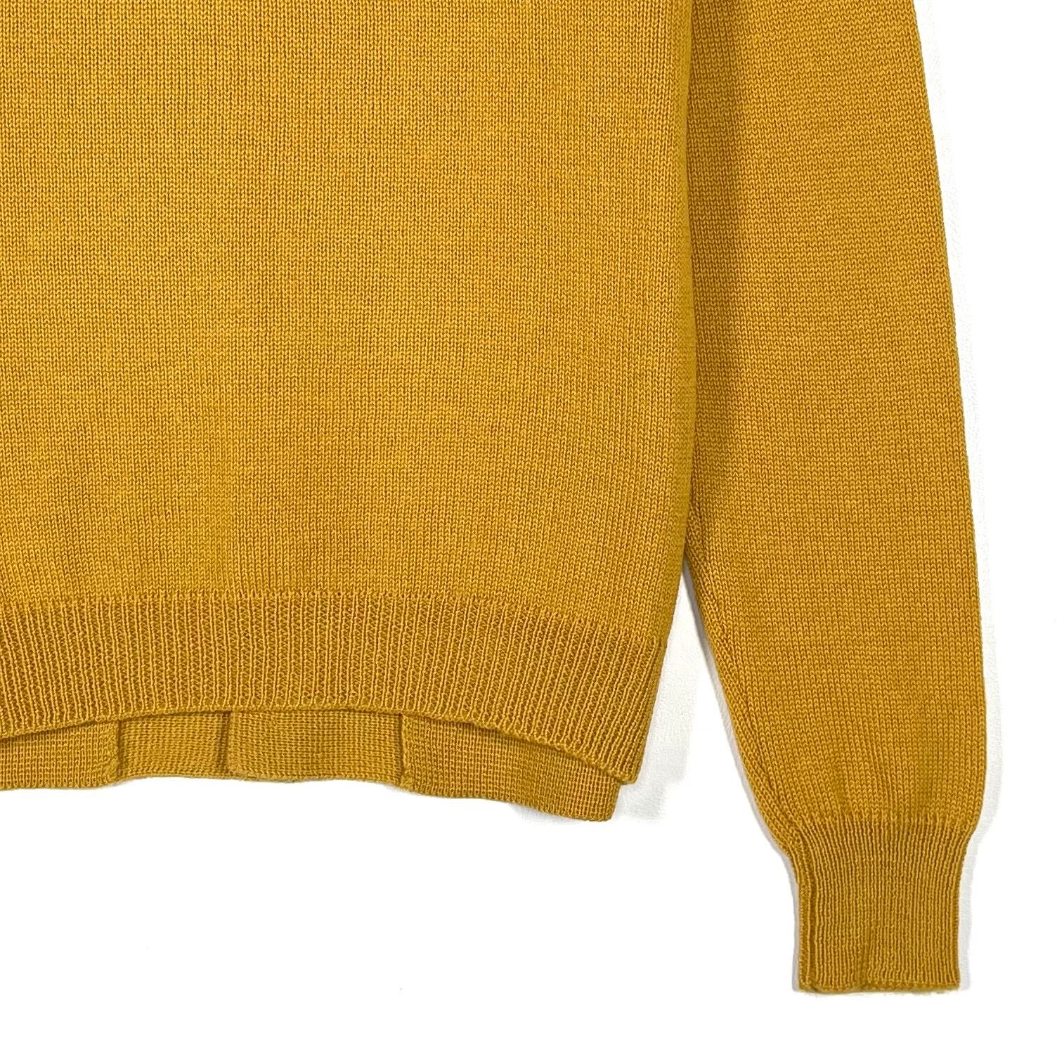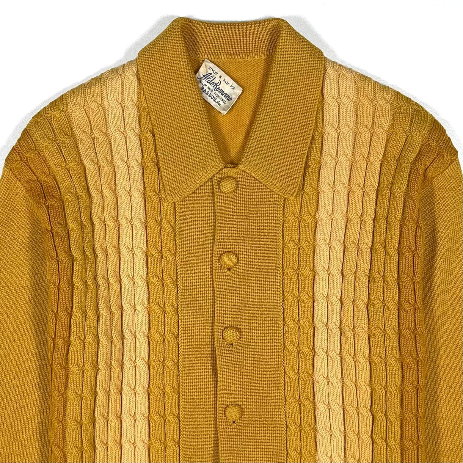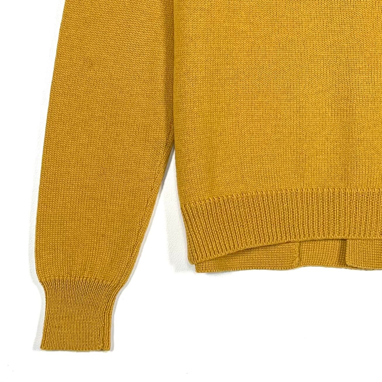 A wool cardigan with a collar in a mustard tone. The front features a cable-knit design in a gradient color. The buttons are fabric-covered, matching the knit (with 2 spare buttons included). Made from wool knit. This cardigan has great color and design. There is slight pilling typical of wool knits due to wear. The tag is about to come off.