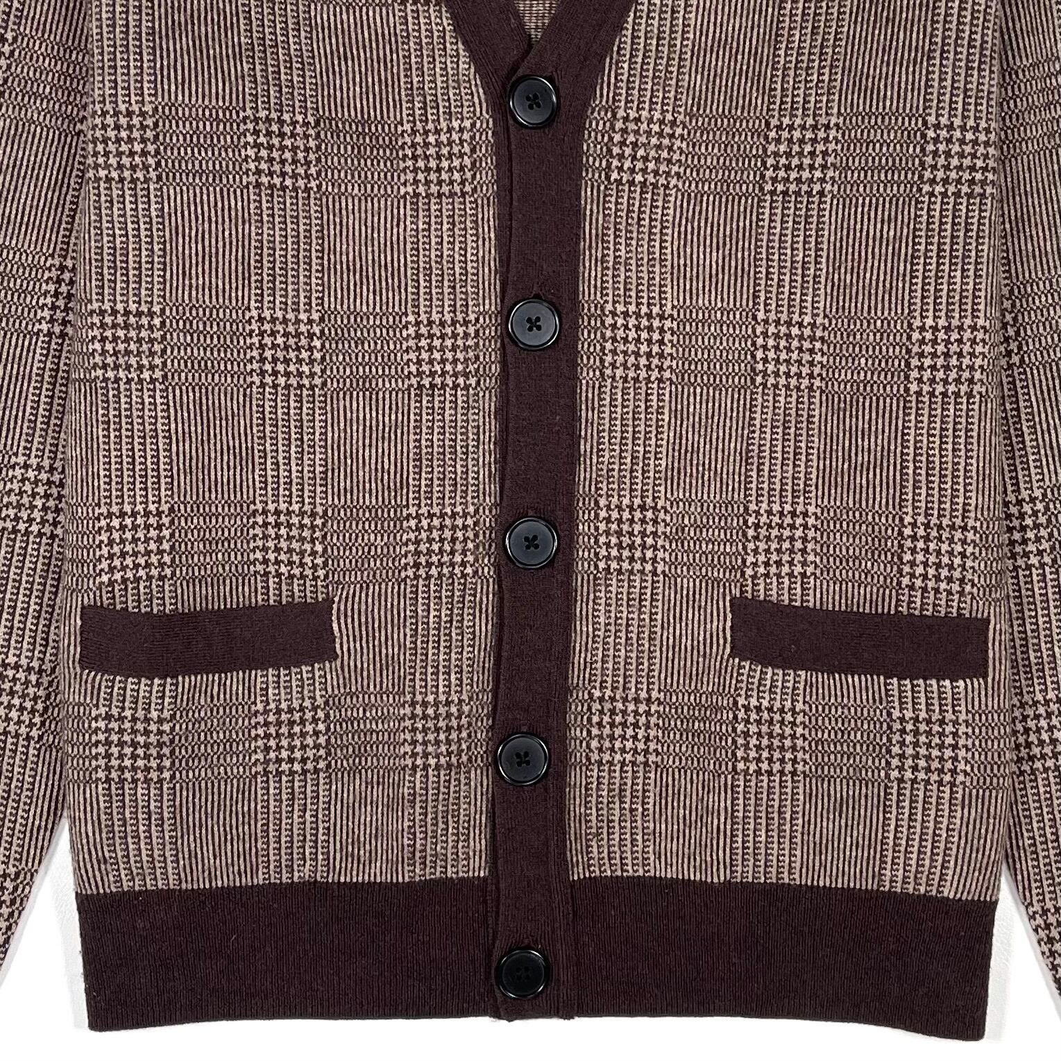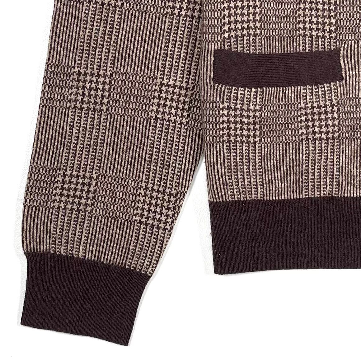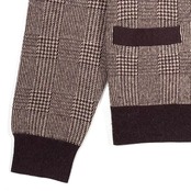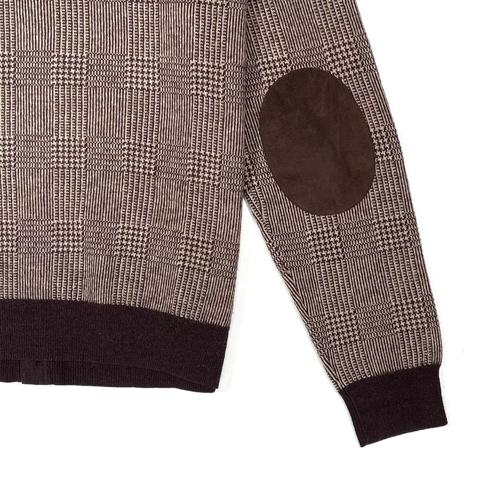 Loose cardigan featuring a brown and beige Glen check pattern. Equipped with side pockets and faux suede elbow patches on both elbows. The oversized design offers a relaxed silhouette. There is a small damage on the right cuff.
