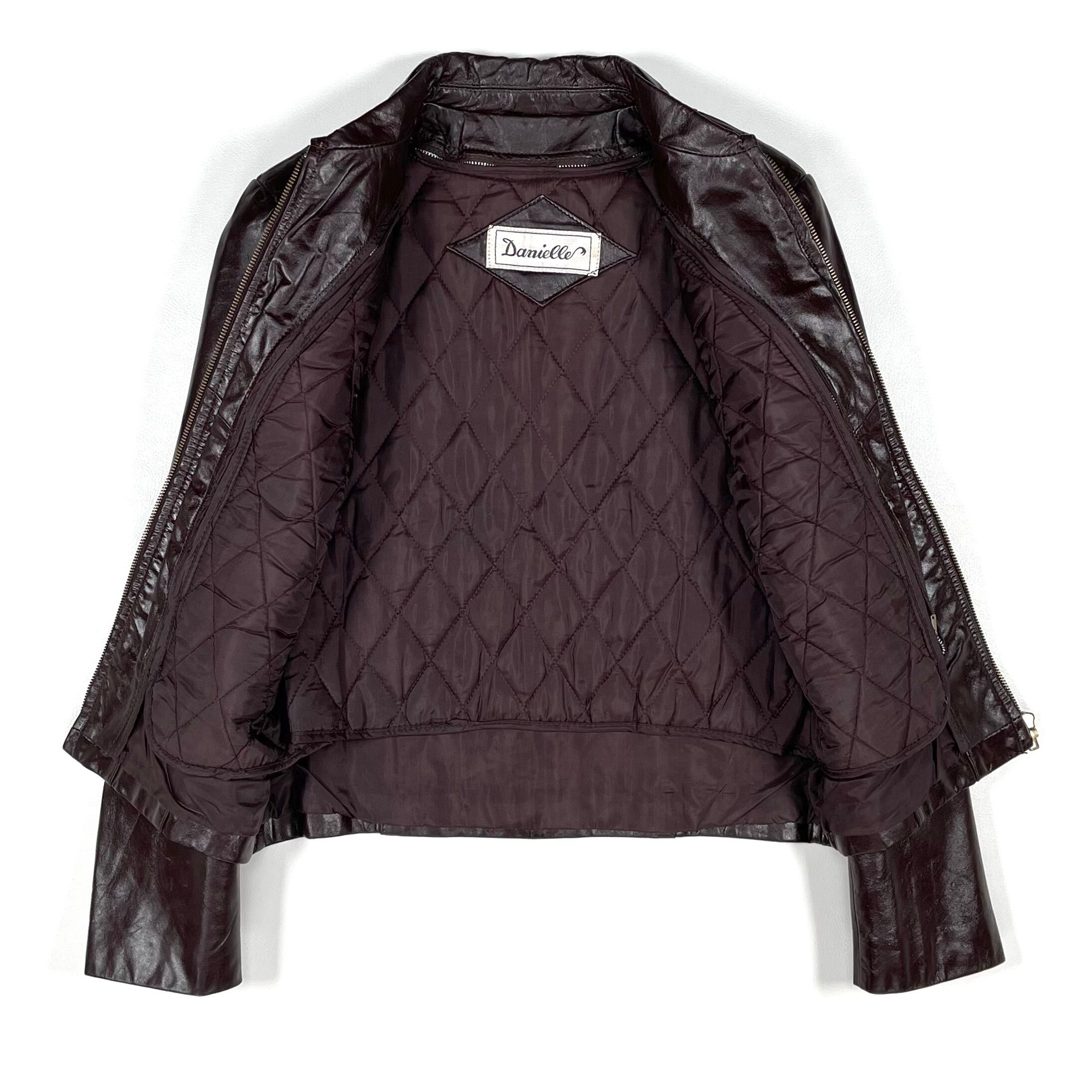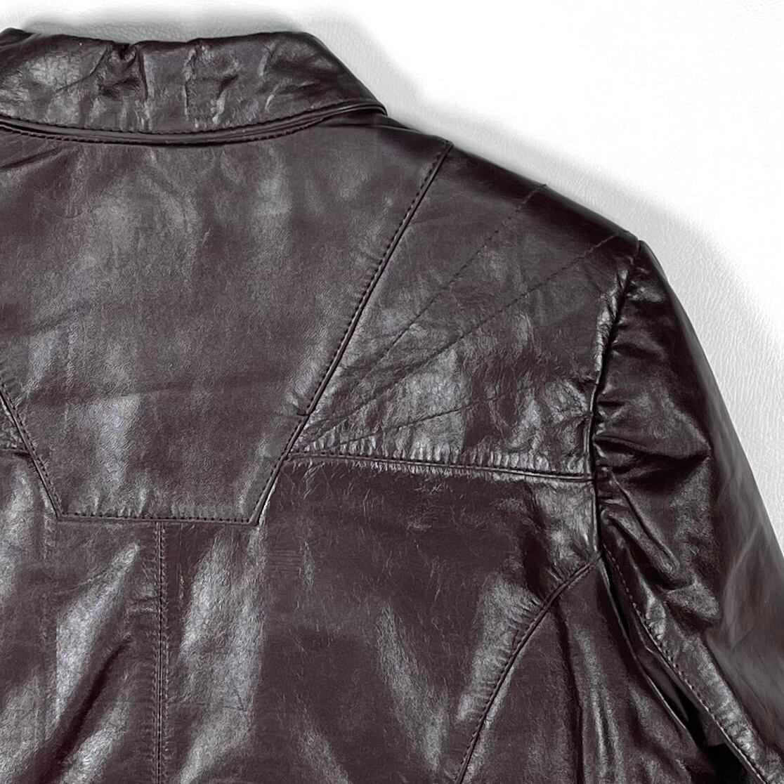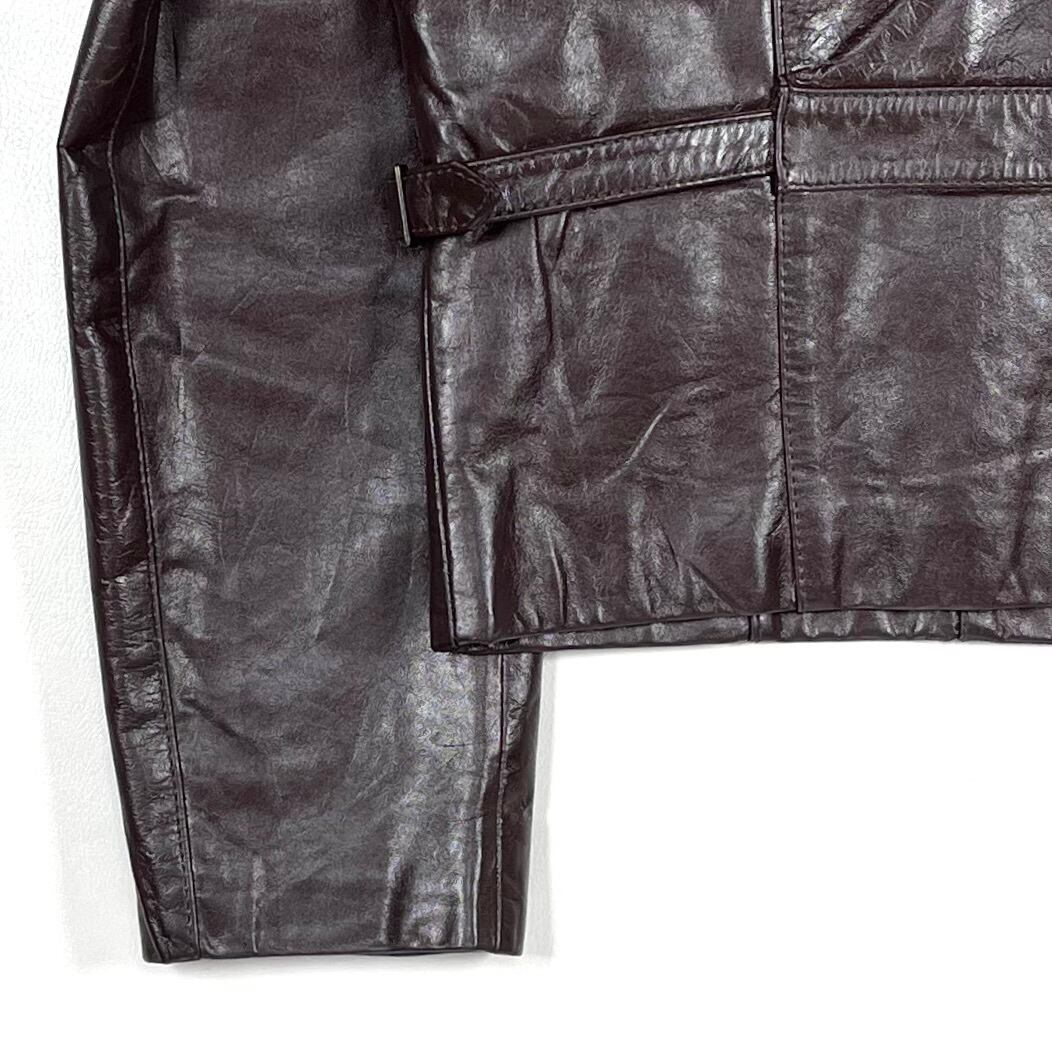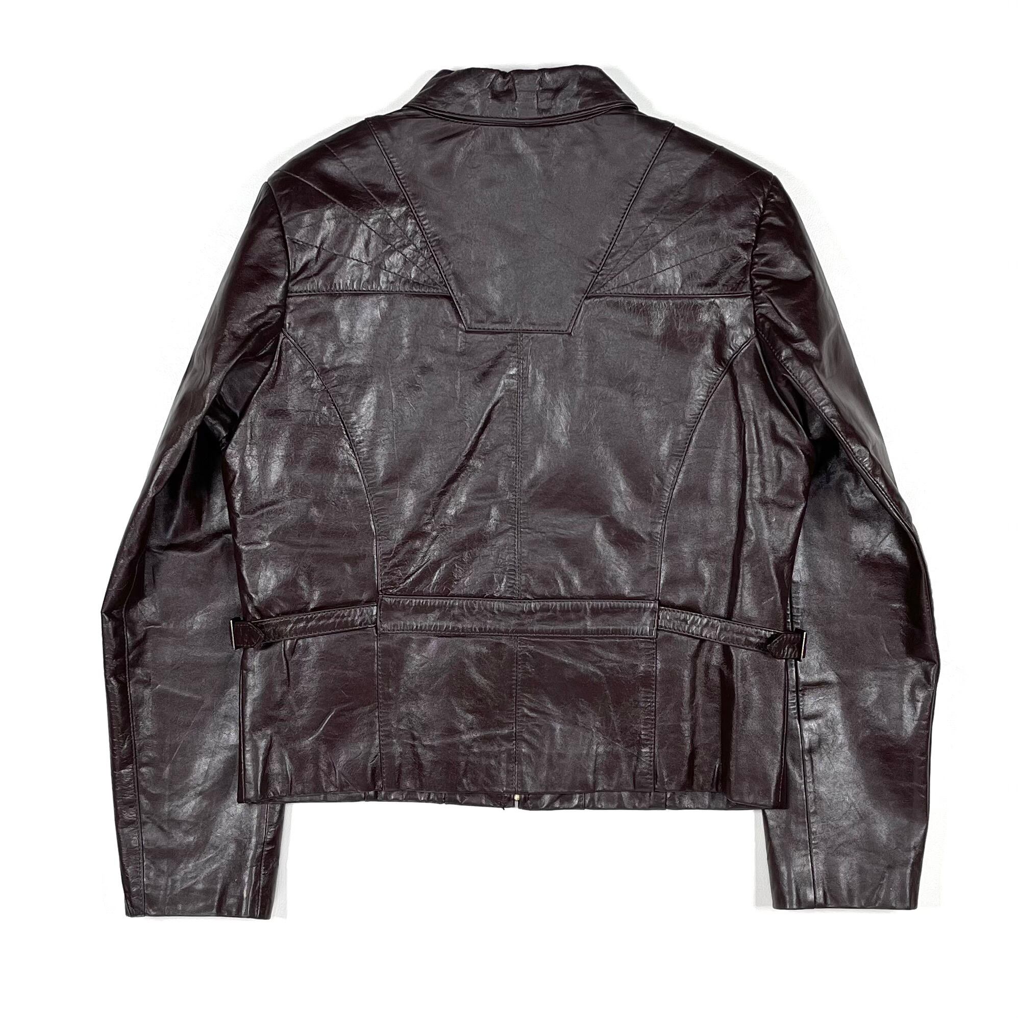A brown leather straight jacket with a front zip and well-balanced panel design. There is distinctive stitchwork on the back shoulder for added style. It features side belts with pockets underneath. The jacket has a short length and a slim, straight silhouette. It comes with a removable vest liner.