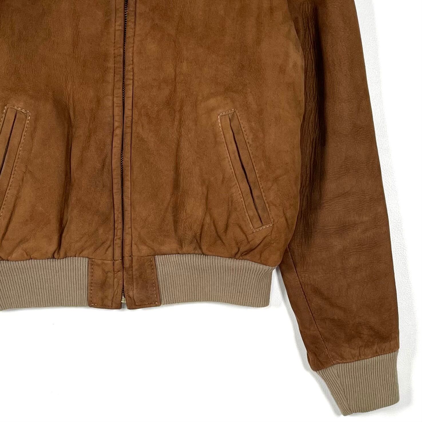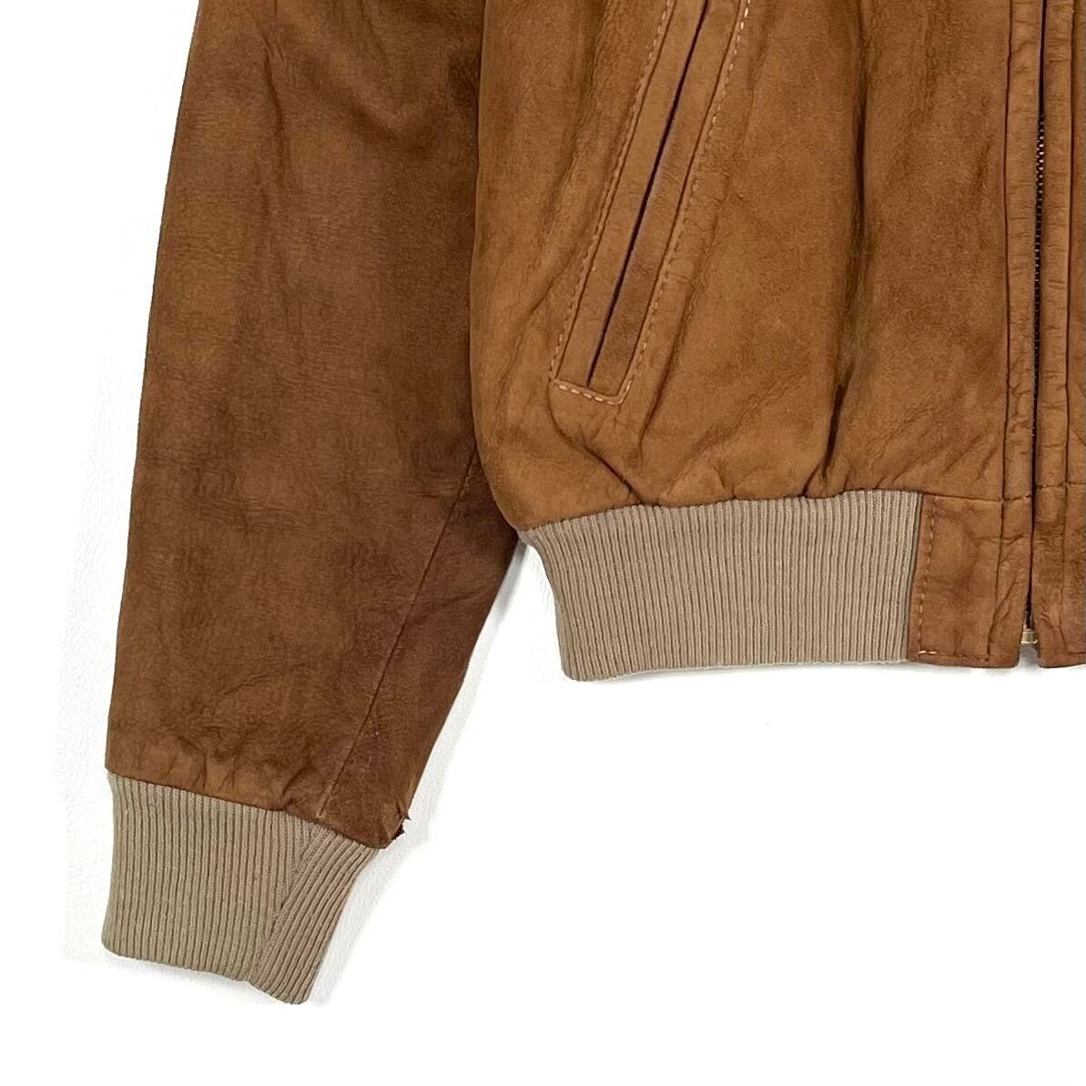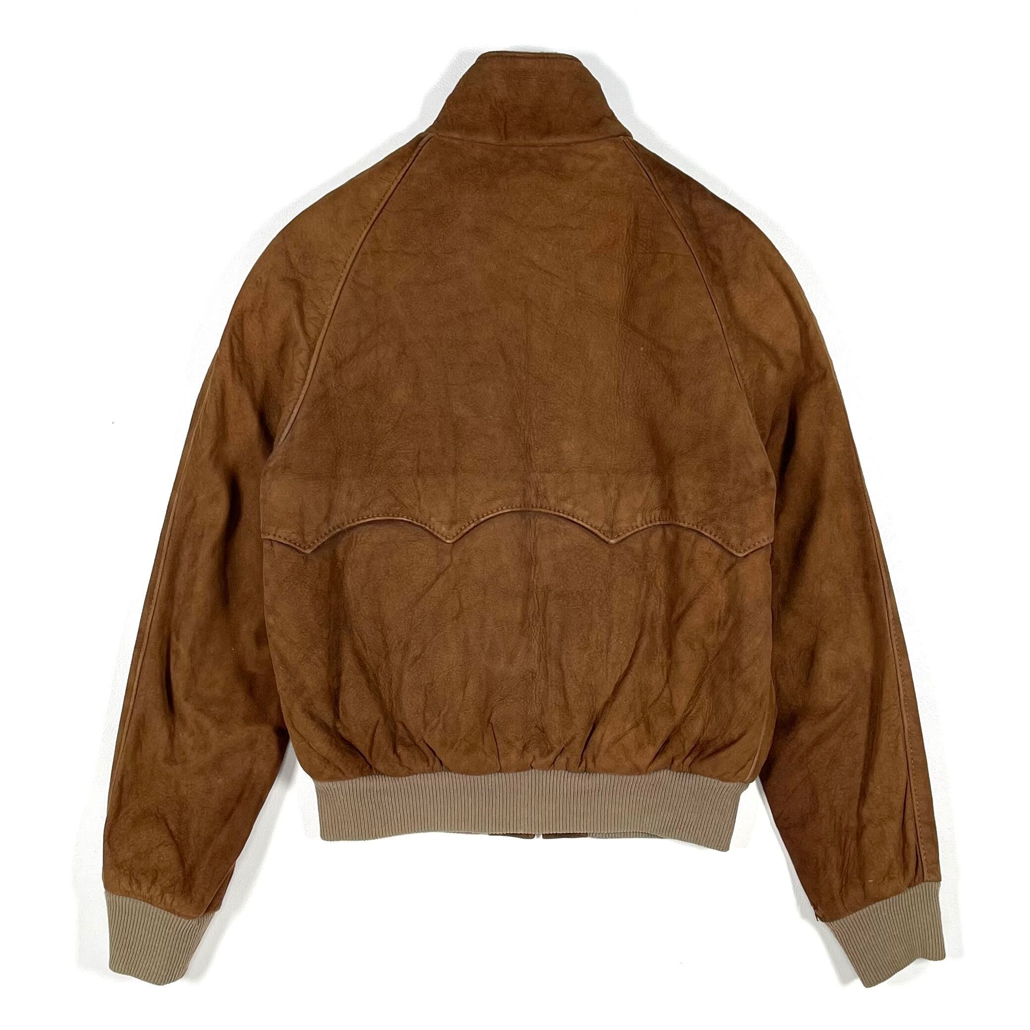 Drizzler jacket made of soft and supple lamb suede nubuck. A basic drizzler jacket design with a stand collar, umbrella yoke on the back, and ribbed hem and cuffs. This is a women’s item designed for a compact fit. There is some damage on the inner rib near the right sleeve, as well as some damage to the lining near the neckline and fading on the ribbing. The jacket shows some signs of dirt and wear.