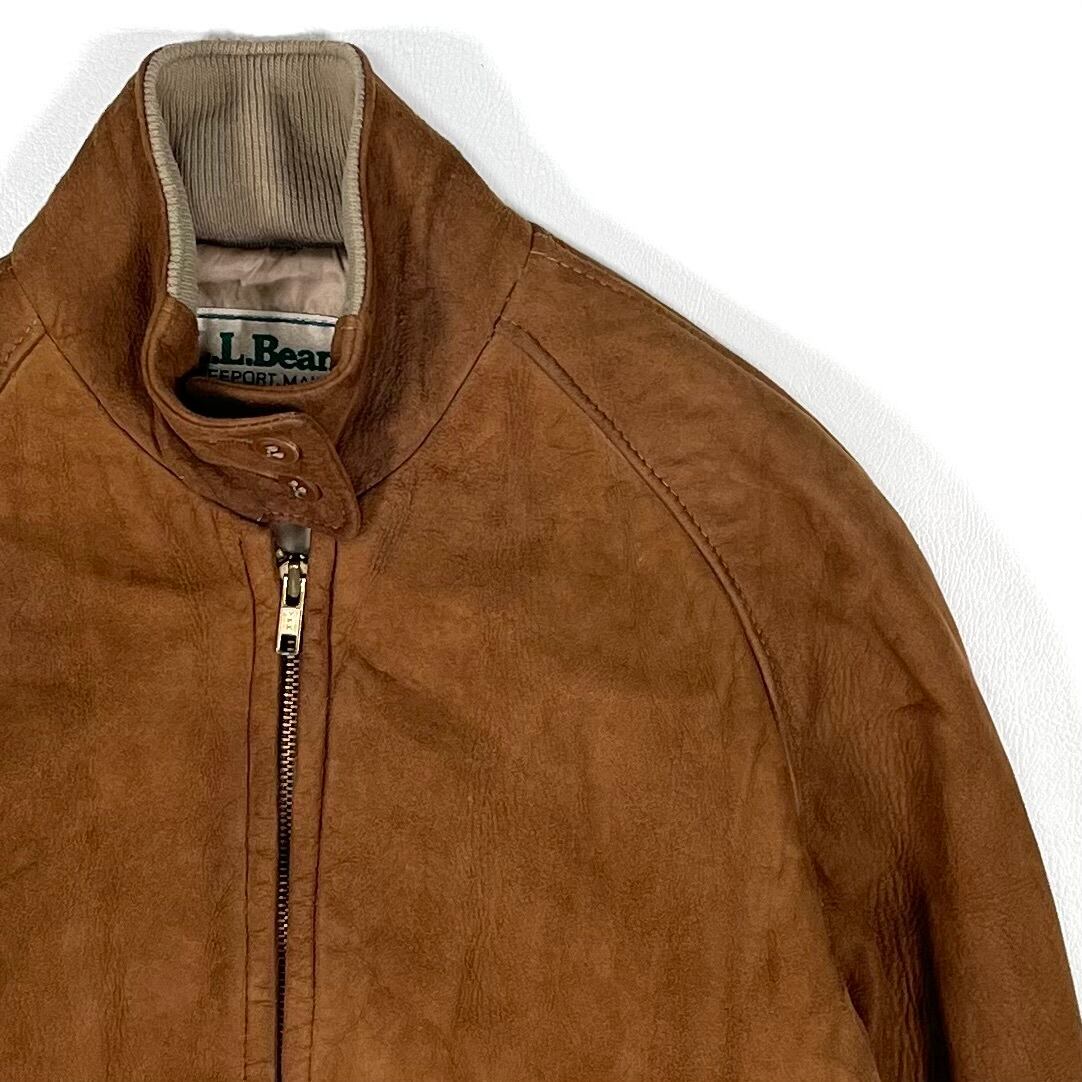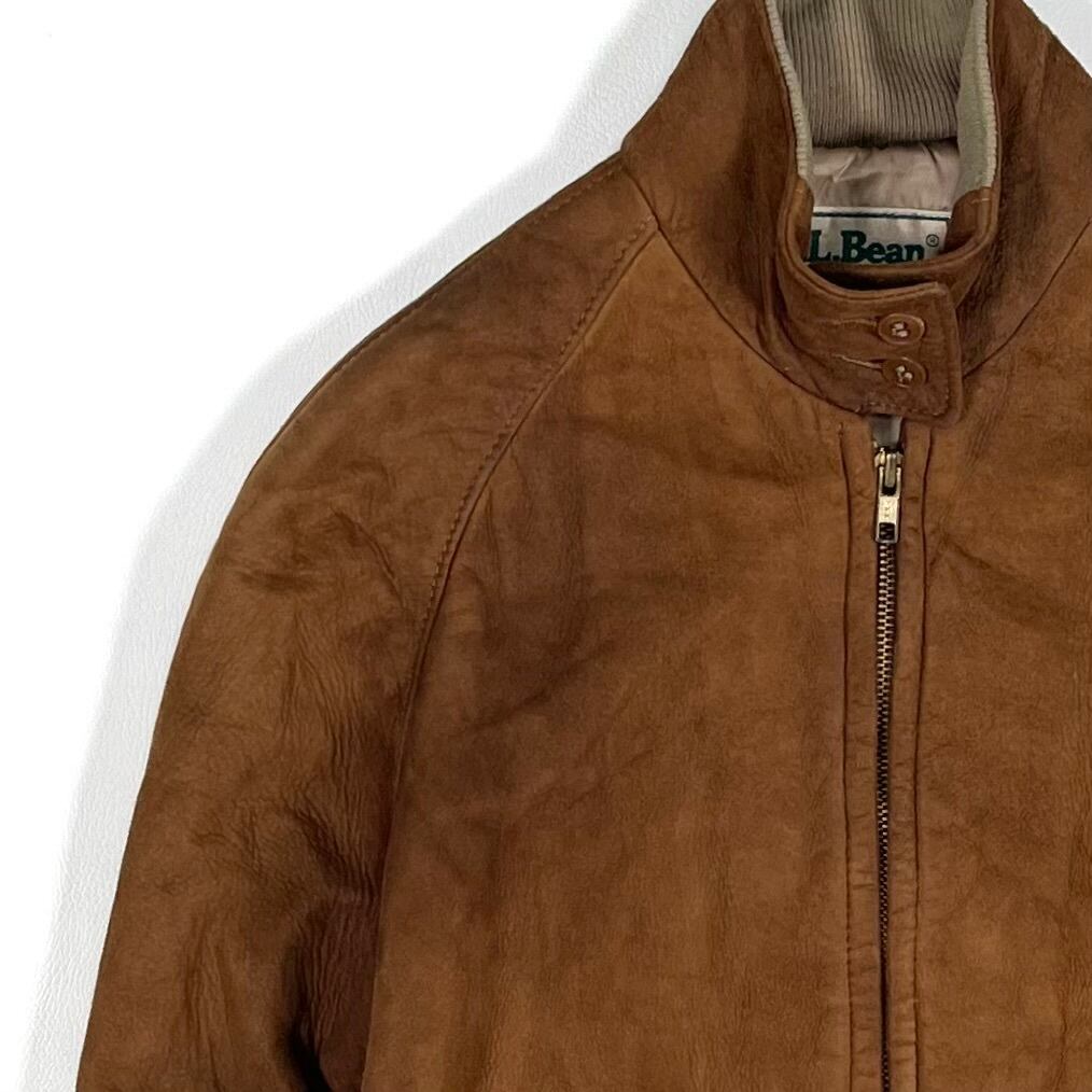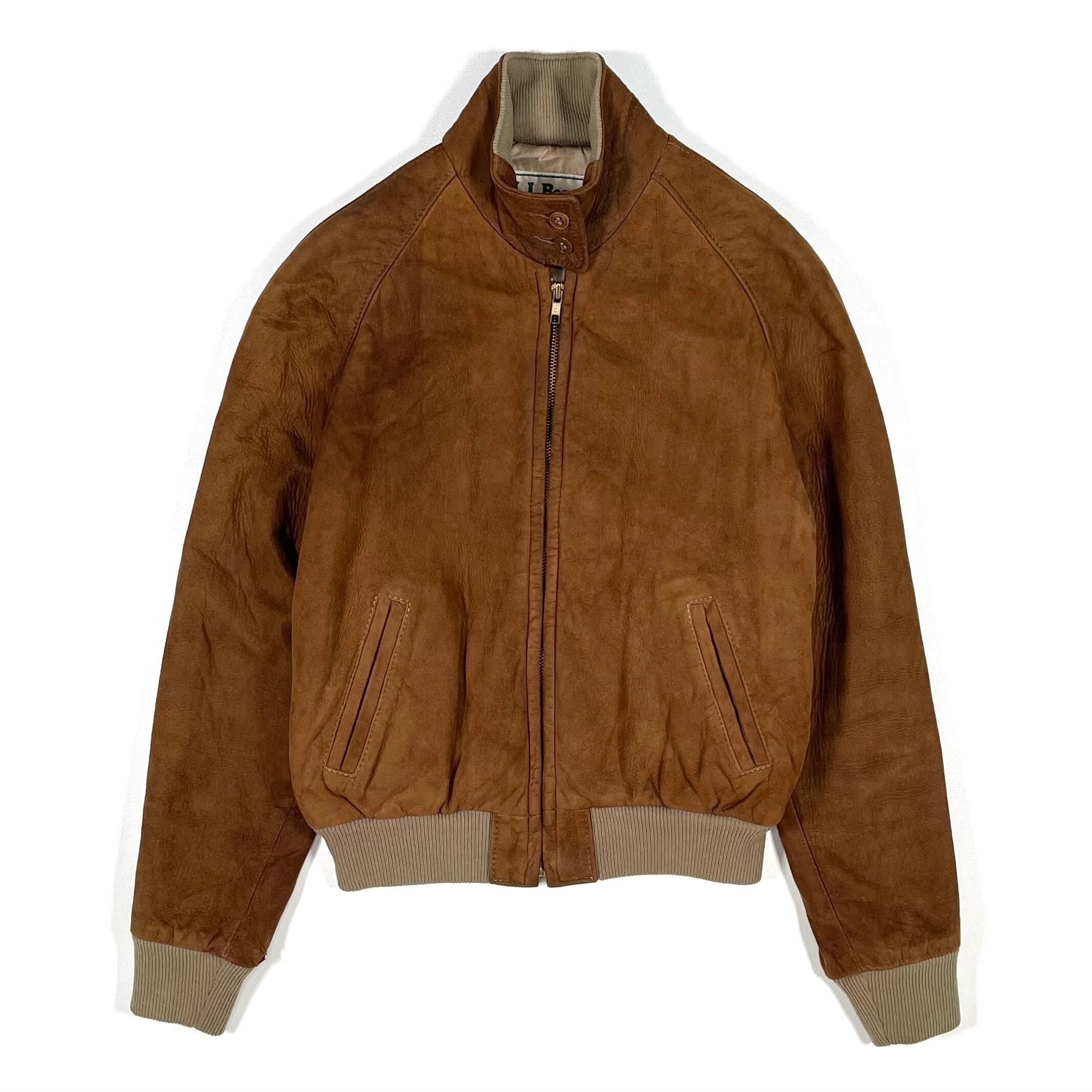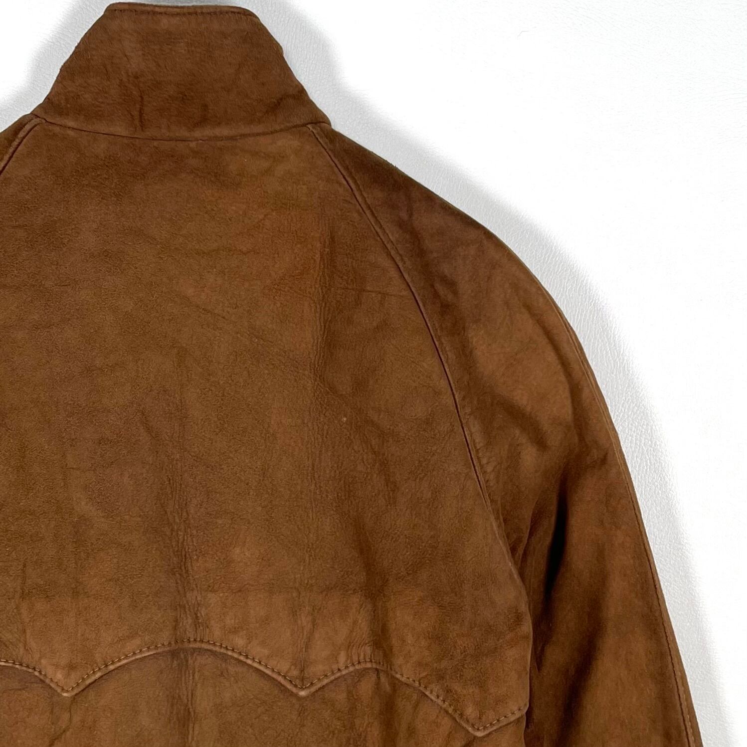Drizzler jacket made of soft and supple lamb suede nubuck. A basic drizzler jacket design with a stand collar, umbrella yoke on the back, and ribbed hem and cuffs. This is a women’s item designed for a compact fit. There is some damage on the inner rib near the right sleeve, as well as some damage to the lining near the neckline and fading on the ribbing. The jacket shows some signs of dirt and wear.
