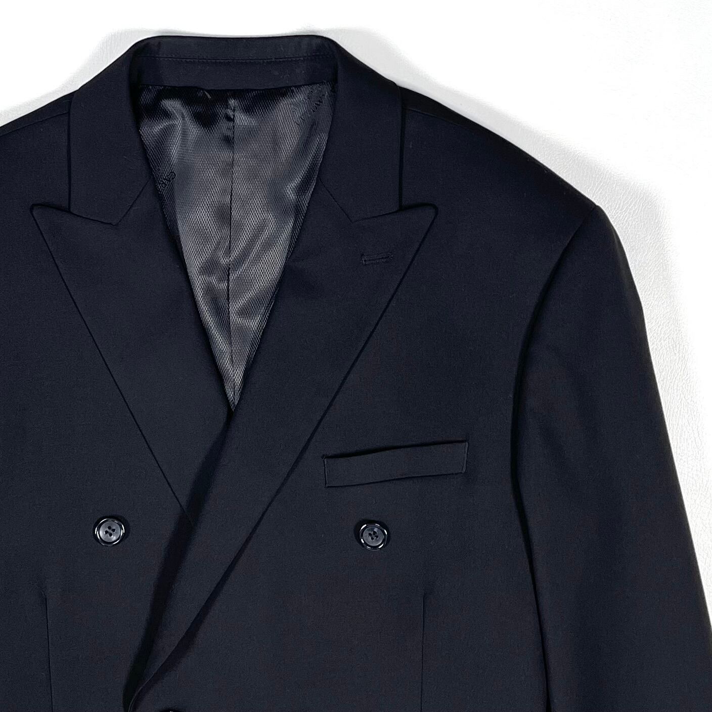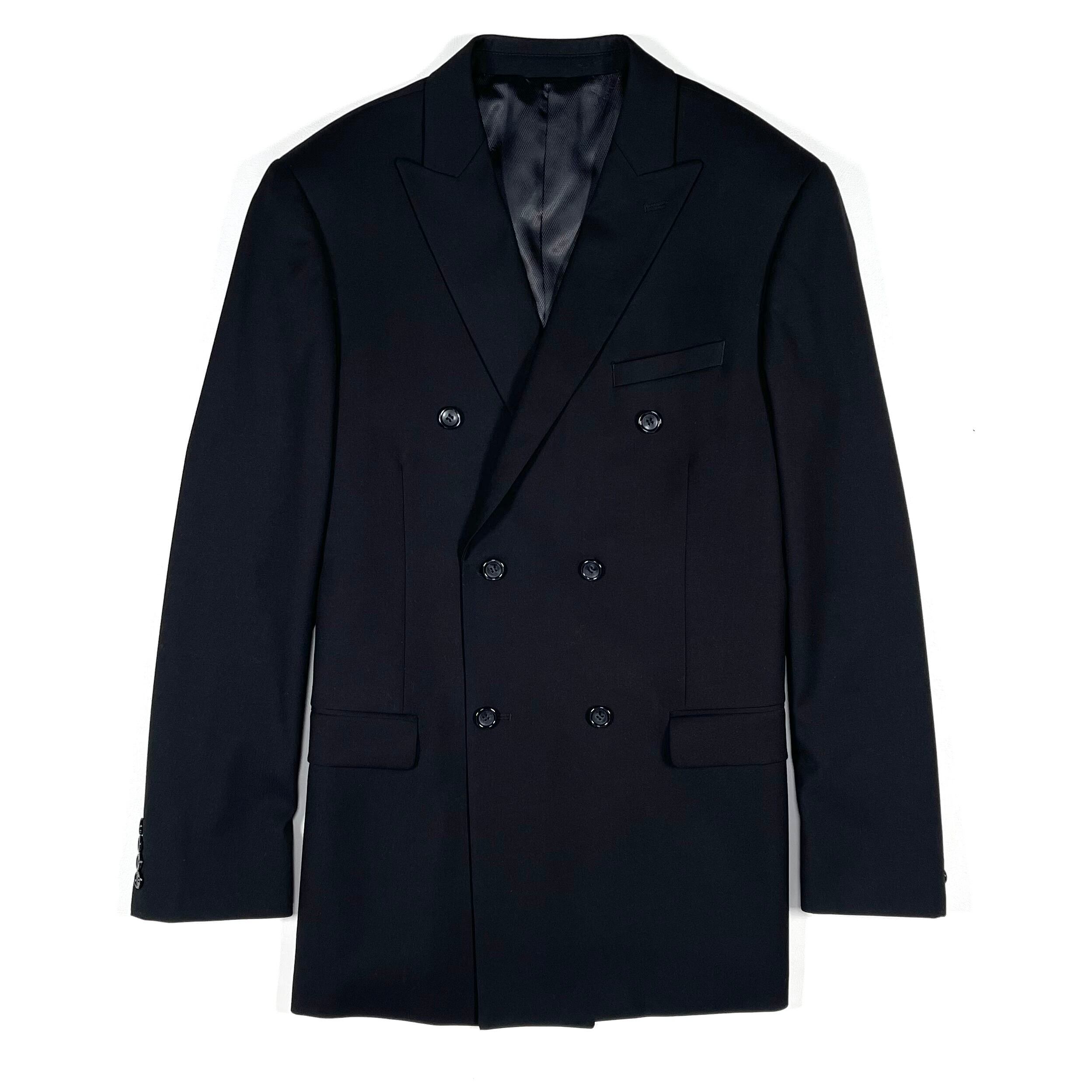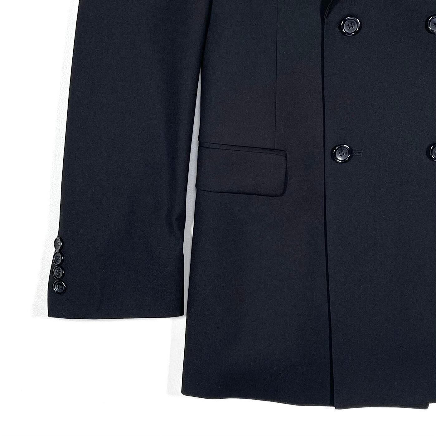 A black double-breasted tailored jacket featuring sharp lapels. The front has a 6-button double-breasted closure, and the sleeves have 4 buttons. Made from 65% polyester and 35% rayon, it has a smooth and sleek feel. The jacket also features side vents and a roomy box silhouette.