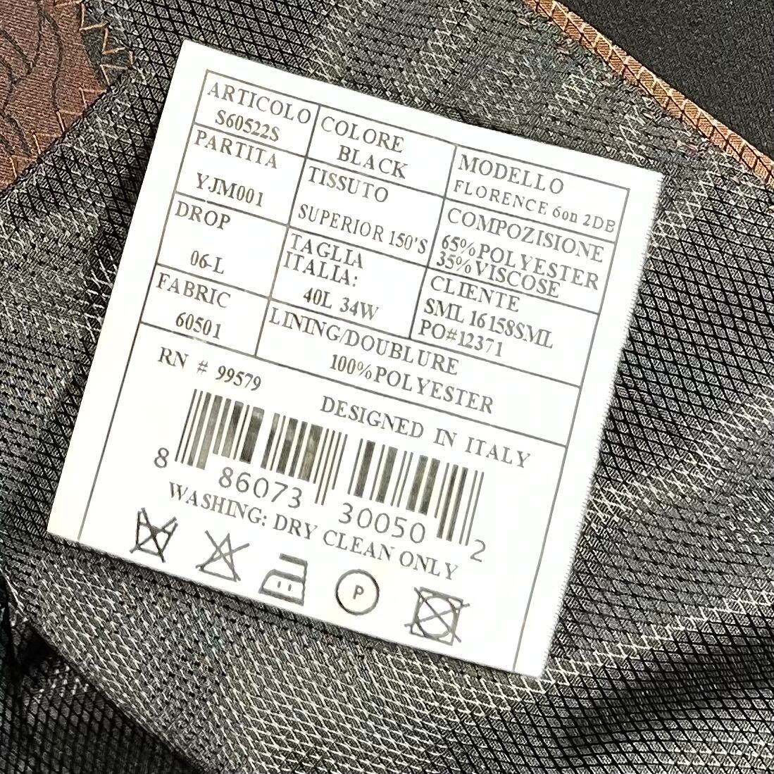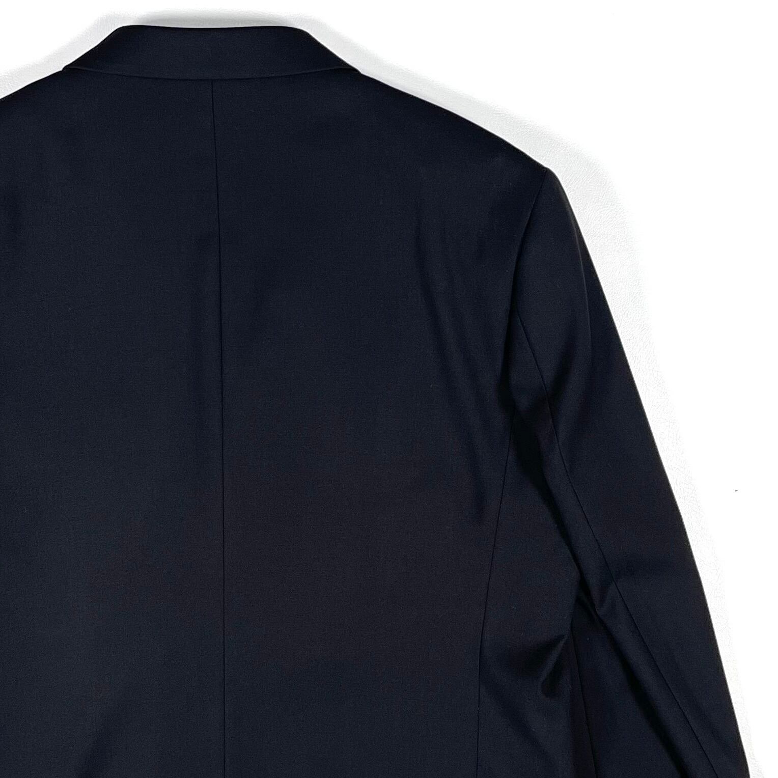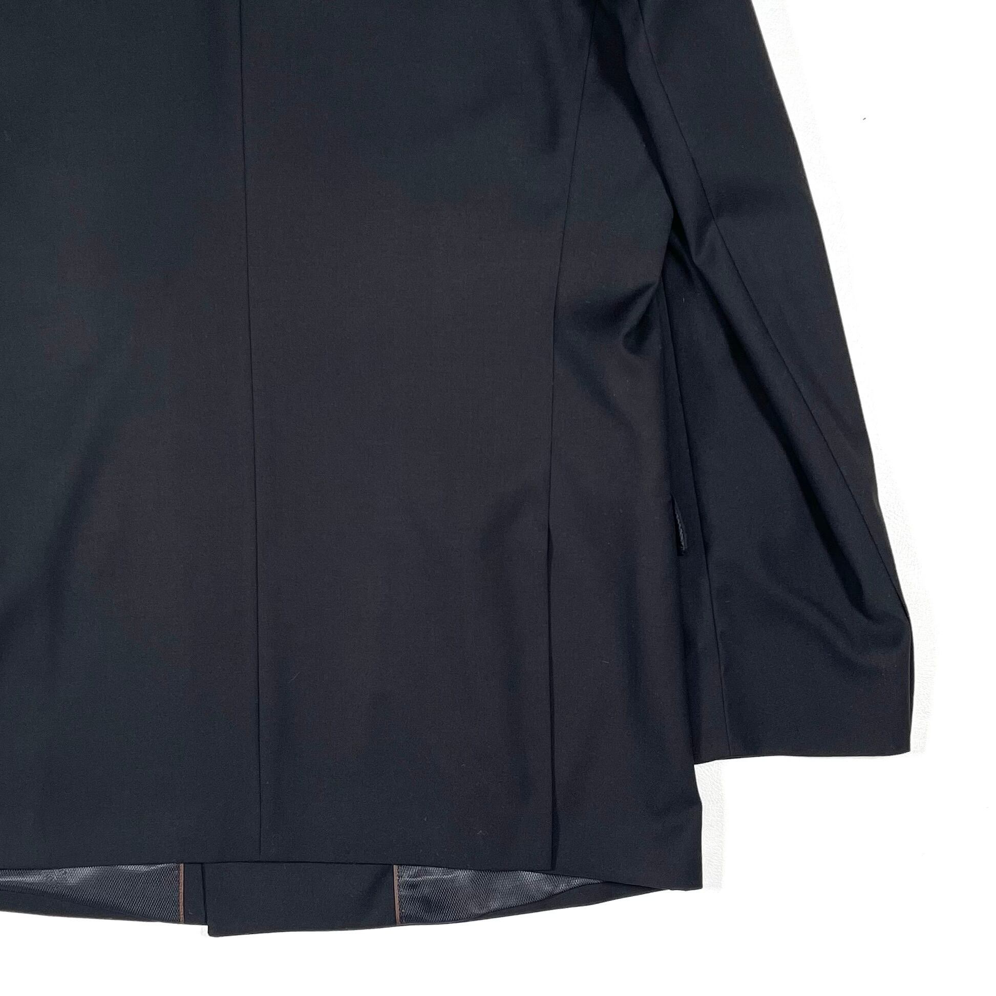 A black double-breasted tailored jacket featuring sharp lapels. The front has a 6-button double-breasted closure, and the sleeves have 4 buttons. Made from 65% polyester and 35% rayon, it has a smooth and sleek feel. The jacket also features side vents and a roomy box silhouette.