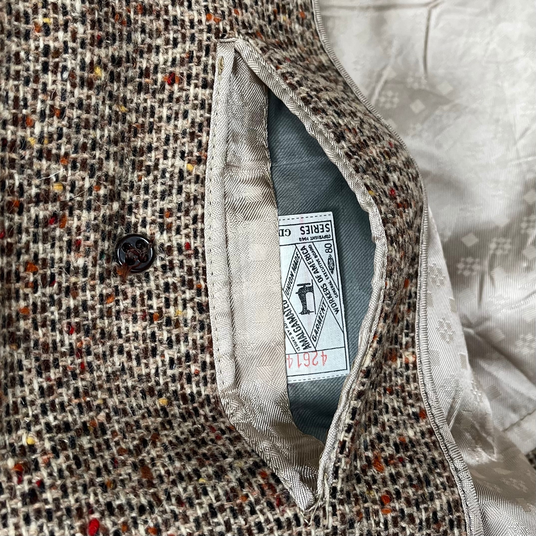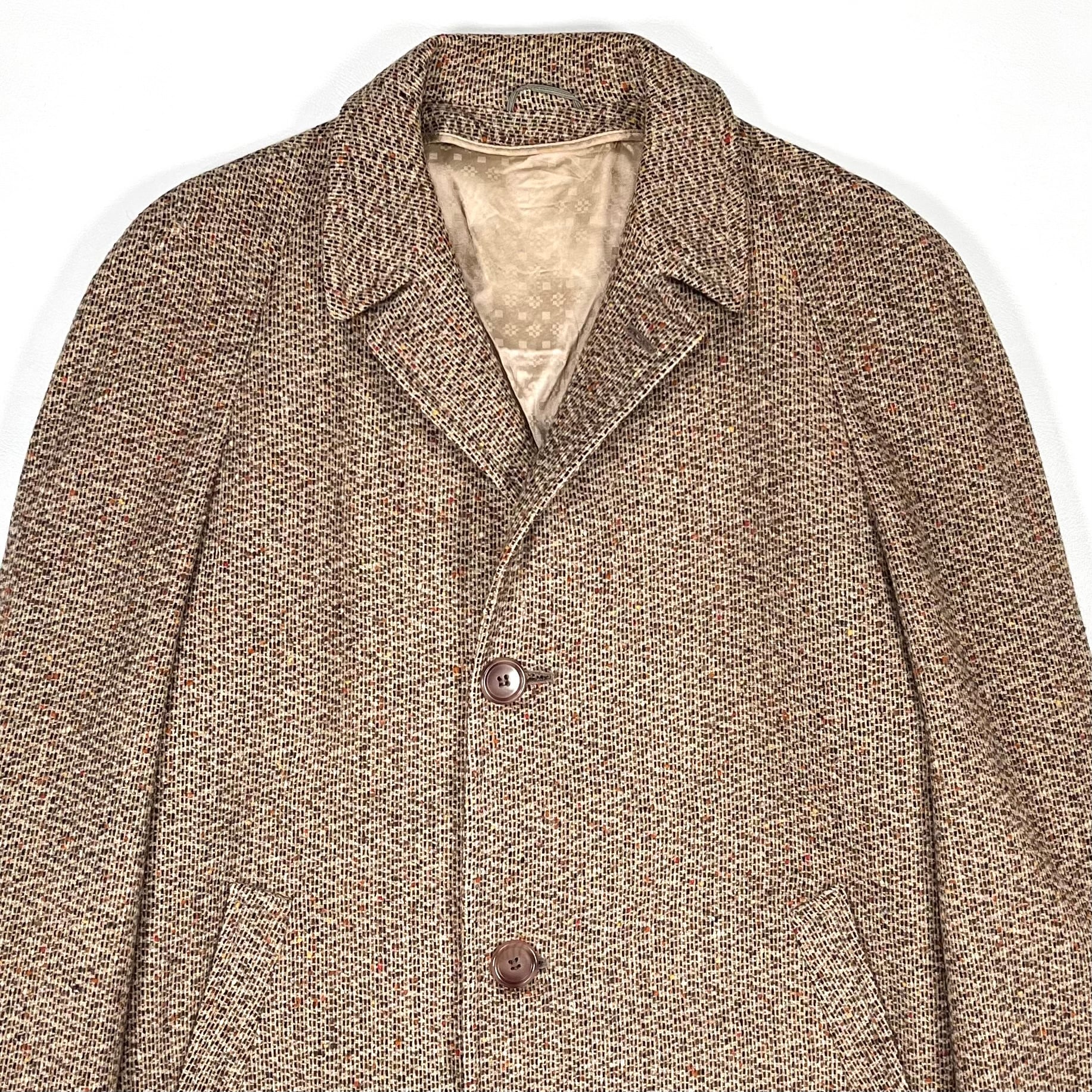 ベージュベースにブラウン系×オレンジ系のネップがあるウールミックスツイードの素材
